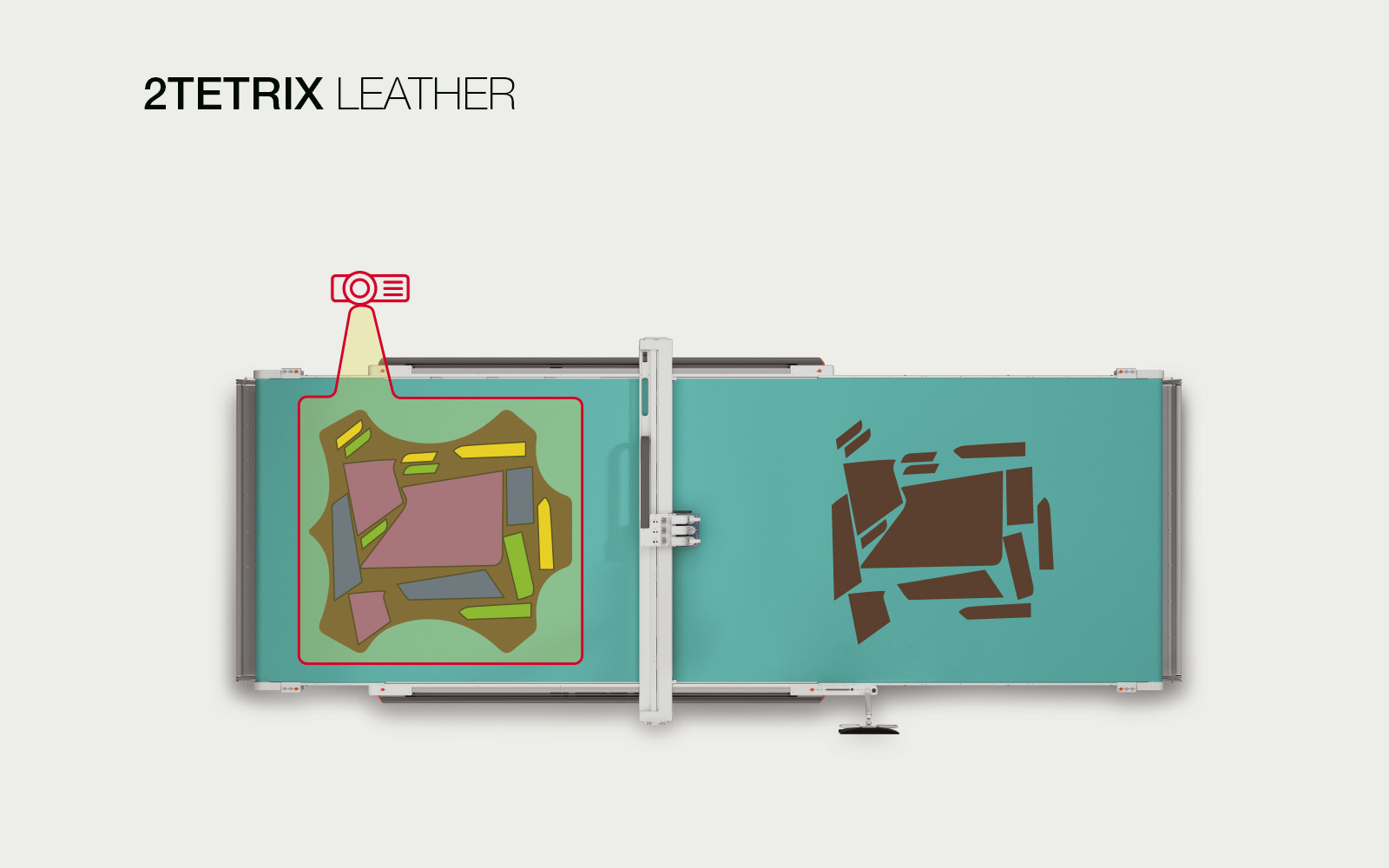2TetrixLeather proietta i pezzi del modello direttamente sulla pelle, rispettando la forma naturale, i difetti e le zone di qualità della pelle, permettendo agli operatori di posizionare ogni componente esattamente al suo posto. Dopo il taglio, i nomi dei modelli vengono proiettati direttamente sulla superficie, consentendo all’operatore di raccogliere rapidamente e senza errori ogni pezzo.
